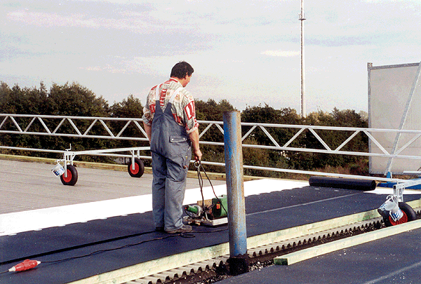 Flachdachabdichtungen in mehreren Bauabschnitten, Gesamtfläche ca. 18.000 m² | Flachdachabdichtung direkt auf alten Aluminiumprofilen. Weiter ist auf dem Bild unsere moderne Gerüsttechnik zu sehen. Wir rüsten Flachdachflächen in der Regel von oben ein. Dies spart Zeit und vor allem Geld. Der Bauherr wir nicht durch ein Gerüst in seinem Tagesablauf gestört, Grünflächen werden geschützt. |